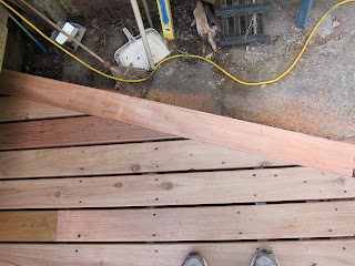 For the sake of maintaining an easy path to the work area we had delayed demolishing the odd-shaped bit of decking that Tom rebuilt about 5 years ago, between the shower and the front of the deck, but one afternoon when I was stymied by lack of the right deck screws I attacked this mini-project. Removing the rusted-in screws demanded some vigorous work with a brace and bit (to maintain enough downward pressure--I now hate regular Philips-heads as they are much more prone to stripping than square-drives or Torx-drives!).